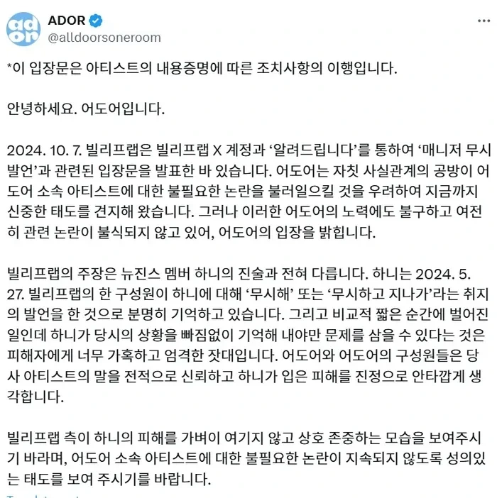 최근 뉴진스의 멤버 하니가 빌리프랩 소속의 한 매니저로부터 "무시해"라는 발언을 들었다고 주장하면서 사건이 시작되었습니다. 이 발언은 하니에게 큰 상처가 되었고, 이에 대해 어도어는 공식적으로 대응하기로 결정했습니다. 하니는 이 발언이 자신에게 어떤 영향을 미쳤는지에 대해 솔직하게 이야기했어요.